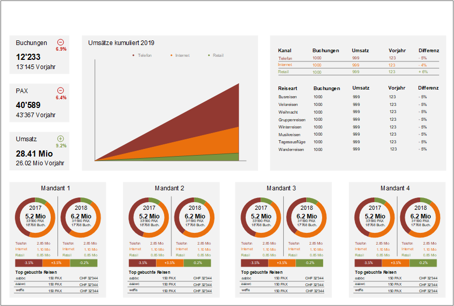 Mit Hilfe des integrierten Dashboards können Sie verschiedene Kennzahlen Ihres Unternehmens direkt auf einen Blick überwachen. Sie behalten so stets den Überblick und wissen genau, wo Sie stehen. Tourdata bietet zudem umfangreiche Statistiken, mit welchen Sie die Kennzahlen bis ins Detail analysieren können.
